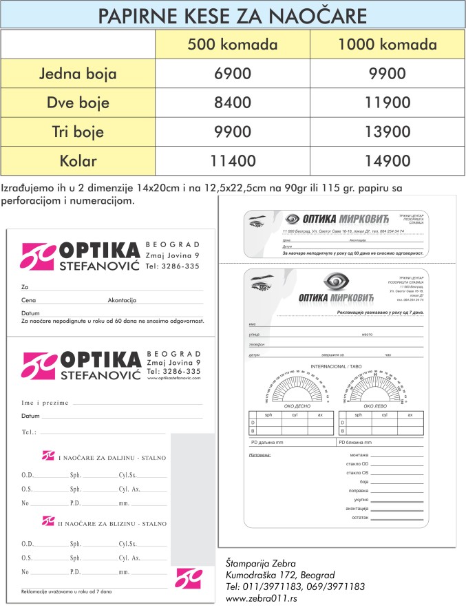 Vizit karte, memorandumi, Blokovska roba, pozivnice, kolor štampa, flajeri, plakati, nalepnice, fascikle, koverte...Dorada - numeracija, perforacija, ricovanje, bigovanje, štancovanje, plastifikacija, laminacija, pravljenje kutija, pakovanje...